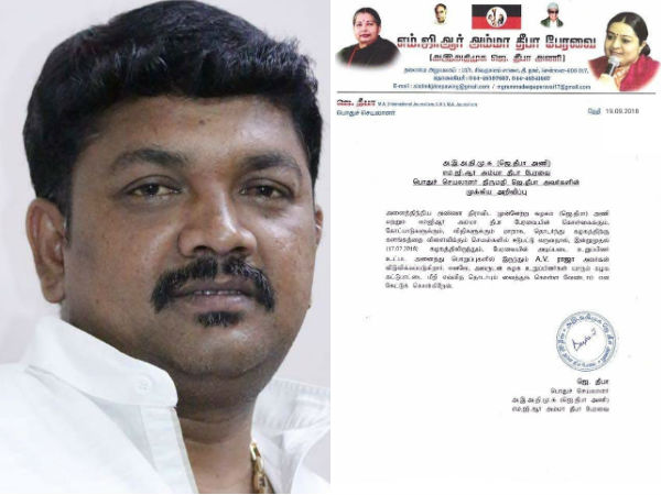 இதுகுறித்து தீபா வெளியிட்ட அறிக்கையில் கூறியிருப்பதாவது: அனைத்திந்திய அண்ணா திராவிட முன்னேற்ற கழகம் (ஜெ.தீபா) அணி மற்றும் எம்ஜிஆர் அம்மா தீபா பேரவையின் கொள்கைக்கும், கோட்பாடுகளுக்கும், விதிமுறைகளுக்கும் மாறாக தொடர்ந்து கழகத்திற்கு களங்கத்தை விளைவிக்கும் செயல்களில் ஈடுபட்டு வருவதால் இன்று முதல் (17-09-2018) கழகத்தில் இருந்தும், பேரவையின் அடிப்படை உறுப்பினர் உட்பட அனைத்து பொறுப்புகளில் இருந்தும் A.V.ராஜா விடுவிக்கப்படுகிறார். எனவே அவருடன் கழக உறுப்பினர்கள் யாரும் கழக கட்டுப்பாட்டை மீறி எவ்வித தொடர்பும் வைத்துக்கொள்ள வேண்டாம் என கேட்டுக்கொள்கிறேன். இவ்வாறு ஜெ.தீபா அறிக்கையொன்றில் 19ம் தேதியான இன்று தெரிவித்துள்ளார்.