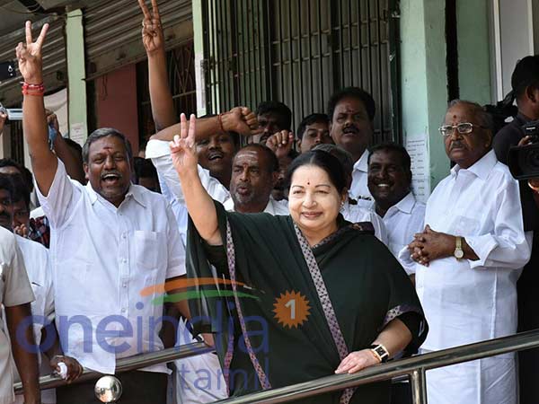 வேட்புமனு தாக்கல் செய்து விட்டு வெளியே வந்த ஜெயலலிதாவைப் பார்த்து தொண்டர்கள் உற்சாக முழக்கமிட்டனர். அவர்களுக்கு வெற்றி நமதே என்று கூறும் வகையில் இரட்டை விரலை உயர்த்திக் காட்டிவிட்டு சிரித்துக்கொண்டே காரில் ஏறி சென்றார் ஜெயலலிதா.