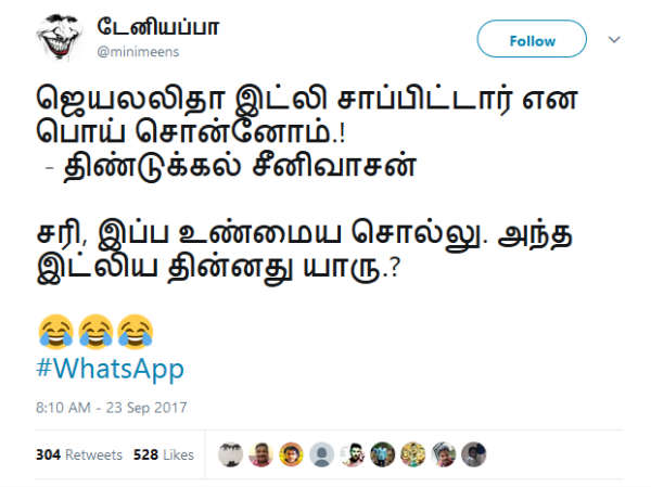 ஜெயலலிதா இட்லி சாப்பிட்டார் என பொய் சொன்னோம்.! - திண்டுக்கல் சீனிவாசன் சரி, இப்ப உண்மைய சொல்லுங்க. அந்த இட்லிய தின்னது யாரு.? என்று கேட்டுள்ளார் ஒரு வலைஞர்.