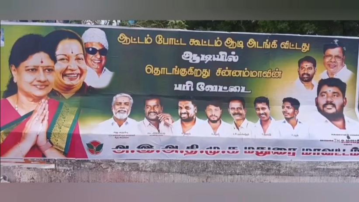 இந்த நிலையில் தென்காசி செல்வதற்காக நேற்று மதுரை விமான நிலையம் வந்த சசிகலாவுக்கு உற்சாக வரவேற்பு அளிக்கப்பட்டது. ஏராளமான நிர்வாகிகள் திரண்டு வந்து புரட்சித்தாய் சின்னம்மா வாழ்க என்ற முழக்கத்தோடு அவரை வரவேற்றனர். மேலும் மதுரையின் பல்வேறு பகுதிகளில் போஸ்டர்களும் ஒட்டப்பட்டு இருக்கிறது. சசிகலா மதுரை வருவதை ஒட்டி அவருடைய ஆதரவாளர்கள் சார்பில் "ஆட்டம் போட்ட கூட்டம் ஆடி அடங்கிவிட்டது. ஆடியில் தொடங்குகிறது சின்னம்மாவின் பரி வேட்டை " அதிமுக மதுரை மாவட்டம் என போஸ்டர் விரகனூர், சிந்தாமணி, பெருங்குடி பகுதியில் ஒட்டப்பட்டுள்ளது.