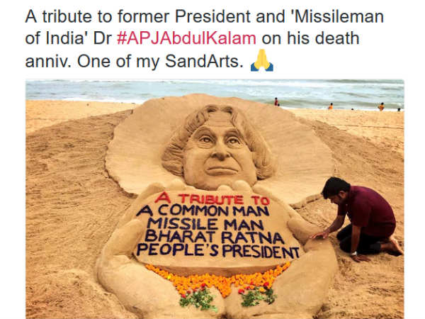 #APJAbdulKalam அவர்களின் முதலாவது நினைவு நாளன்று பிரபல மணல் சிற்ப கலைஞர் சுதர்சன் பட்நாயக் தனது பாணியில் அஞ்சலி செலுத்தியுள்ளார்.