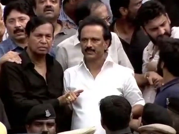 அதேபோல் கருணாநிதி வைக்கப்பட்டு இருக்கும் கண்ணாடி பேழை தூக்கப்பட்ட போது, பெரிய அளவில் மக்கள் கோஷம் எழுப்பினர். திமுக உறுப்பினர்கள் கத்தி கூச்சலிட்டார்கள். இதனால் அங்கு மிகவும் கனமான சூழ்நிலை நிலவி வருகிறது.