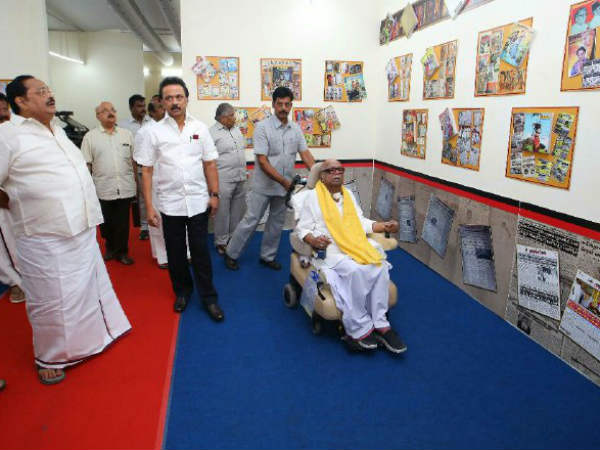 முரசொலி பவளவிழா கண்காட்சியில் ஒவ்வொரு அரங்காக 40 நிமிடம் பார்வையிட்ட கருணாநிதி!