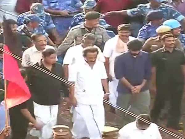 ராணுவ வாகனத்தில் ஏறவில்லை.. ஊர்வலத்தில் தொண்டர்களுடன் நடந்து செல்லும் ஸ்டாலின்