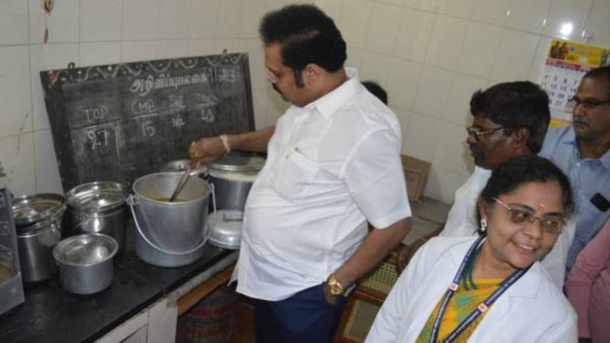 வாளி ஒன்றில் வைக்கப்பட்டிருந்த சாம்பாரை கலக்கிவிட்டு கரண்டியில் தனது கையில் ஊற்றி அதனை குடித்துப் பார்த்த கதிர் ஆனந்த், நோயாளிகளுக்கு கொடுக்கப்படும் உணவு என்பதால் தூய்மையில் சமரசமின்றி நடந்துகொள்ள வேண்டும் என உயர் மருத்துவ அலுவலர்களுக்கு அறிவுறுத்தினார்.