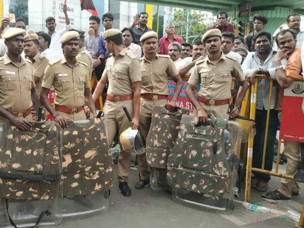 கண்ணீர் புகைக்குண்டு, துப்பாக்கி, லத்தியுடன் காவேரி மருத்துவமனையில் போலீசார் குவிந்துள்ளனர். மேலும் அதிரடிப்படையினரும் மருத்துவமனை முன்பு குவிந்துள்ளனர்.