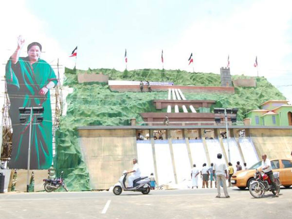 கோட்டை வடிவிலான முகப்பு அமைக்கப்பட்டு, பெரியாறு அணை போன்று மாதிரி வடிவமும் மிகப்பெரியஅளவில் உருவாக்கப்பட்டு இருக்கிறது. இரவை பகலாக்கிடும் வகையில் விளக்குகள் போடப்பட்டுள்ளன.