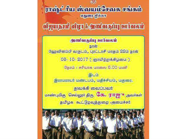 விஜயதசமியையொட்டி ஆர்எஸ்எஸ் அமைப்பு பேரணிகளை நடத்துவது வழக்கம். வரும் 8ம் தேதி மதுரையில் ஆர்.எஸ்.எஸ் பேரணி நடத்த திட்டமிட்டுள்ளது. இந்த பேரணியை அமைச்சர் செல்லூர் ராஜு துவக்கி வைப்பார் என போஸ்டர்கள் அச்சடிக்கப்பட்ட நிலையில், அதற்கு விளக்கம் அளித்த அமைச்சர், தனது அனுமதி இன்றியே இவ்வாறு போஸ்டர்கள் அடிக்கப்பட்டதாக தெரிவித்தார்.