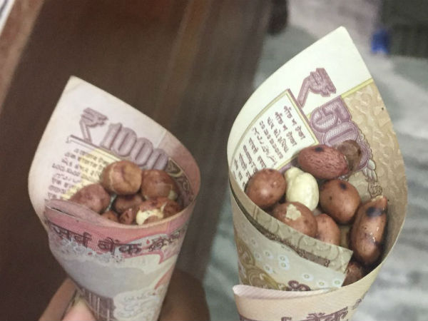 அடடே இனி 500 ரூபாய், 1000 ரூபாய் எல்லாம் பொட்டலம் மடிக்கத்தான் லாயக்கா என்று சொல்லாமல் சொல்கின்றனர். மிக்சர், கடலைப் பருப்பு வைத்து கட்டிக் கொடுக்கின்றனர்.