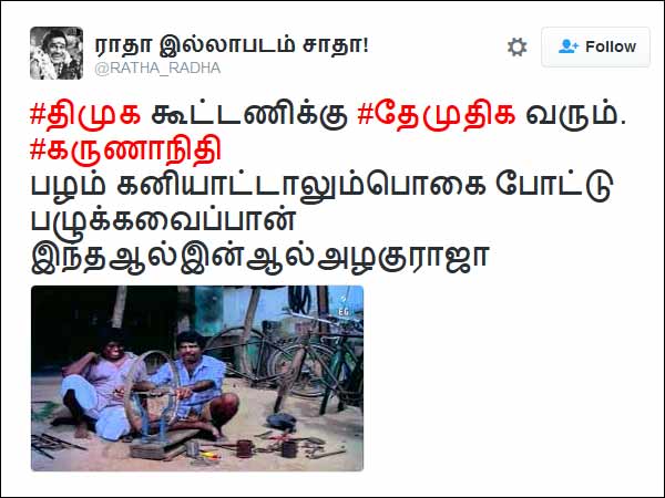 ஒரு திரைப்படத்தில், பஞ்சாயத்தாரை குழப்புவதற்காக வடிவேலு, திரும்ப, திரும்ப ஒரே வார்த்தையை பேசுவார். அதைப்போல கூட்டணி பற்றி கருணாநிதி பேசிவருவதாக கேலி செய்கிறது இந்த டிவிட்.