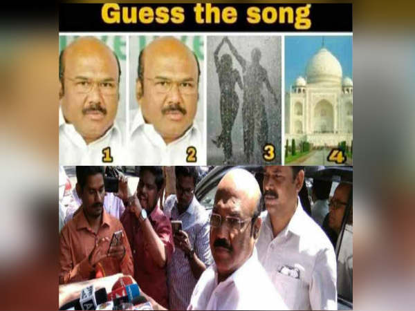 அவரது வழுக்கை தலையை கிண்டல் செய்து கெஸ் தி சாங் என்ற பெயரில் முதலிரண்டு படங்கள் அமைச்சர் ஜெயக்குமாரின் முகத்தை மட்டும் போட்டுள்ளனர். மூன்றாவதாக மழையில் நனைவது போன்ற படத்தையும், 4-ஆவதாக தாஜ்மகால் படத்தையும் போட்டுள்ளனர்.
