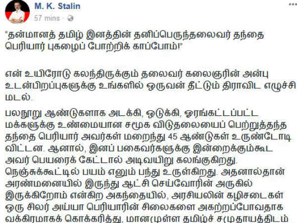 அதனை இந்த நேரத்தில் நினைவூட்டி, தந்தை பெரியாரின் புகழ் காக்கும் பணியில் ஆர்ப்பாட்டக் களமிறங்கியிருக்கும் அனைத்துத் தரப்பினருக்கும், திராவிட முன்னேற்றக் கழகத்தின் செயல் தலைவர் என்ற முறையில் என் உளமார்ந்த வாழ்த்துகளையும், ஆதரவினையும் தெரிவிக்கக் கடமைப்பட்டுள்ளேன். இனி கற்பனையிலும் அல்லது கனவிலும் கூட பெரியார் சிலைகளை அகற்றுவோம் என்கிற எண்ணம் எவருக்கும் ஏற்படாது. இன்னும் எவரேனும் இதே எண்ணத்துடன் மிச்சமிருந்தால், பெரியார் சிலையைத் தொட்டுப் பார்க்கட்டும். திராவிட இலட்சியங்களைக் காக்கும் பெரியாரின் பேரப்பிள்ளைகளான தி.மு.கழக தோழர்கள் தாங்கள் யார் என்பதைக் காட்டும் தருணம் வரும்!