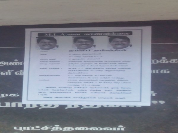 இவரை காணாது தவிக்கும் நெல்லையில் ஓட்டுப்போட்ட மக்கள் தேடுகிறார்கள். கண்டுபிடித்து போட வேண்டிய இடம் நெல்லையப்பர் கோயில் உண்டியல், திருநெல்வேலி டவுன். வெகுவிரைவில் சொத்துக்கள் பட்டியல் வரும். இவ்வாறு அந்த நோட்டீசில் அச்சிடப்பட்டு ஒட்டப்பட்டுள்ளது. அதிமுகவை தோற்றுவித்த எம்ஜிஆரின் சிலையின் கீழே அந்த கட்சியின் எமஎல்ஏவை காணவில்லை என சுவரொட்டி ஒட்டப்பட்டுள்ளது நெல்லையில் பரபரப்பை ஏற்படுத்தியுள்ளது.