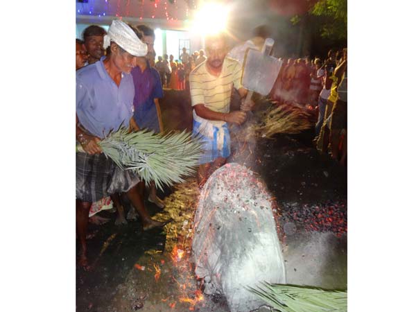 ஆண்கள், சிறுவர்கள் பத்து நாட்கள் முன் காப்பு கட்டி விரதமிருந்து மொகரம் அன்று அதிகாலை கண்மாயில் நீராடி விட்டு வரிசையாக தீக்குழி இறங்குகின்றனர்.