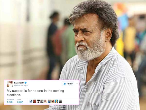 இந்த நிலையில் ரஜினிகாந்த் இன்று தமது ட்விட்டர் பக்கத்தில் வரும் தேர்தலில் யாருக்கும் ஆதரவு இல்லை என திட்டவட்டமாக தெரிவித்துள்ளார். ரஜினிகாந்தை ஒவ்வொரு தேர்தலிலும் வளைத்துப் போட்டு மக்களை ஏமாற்ற நினைக்கும் பாஜகவின் முகத்தில் கரியை பூசிவிட்டார் ரஜினிகாந்த் என்றே சொல்ல வேண்டும்.