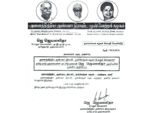 அதிமுக பொதுச் செயலாளரும் தமிழக முதல்வருமான ஜெயலலிதா இன்று வெளியிட்டுள்ள ஒரு அறிக்கையில் "அதிமுக மருத்துவர் அணி தலைவர் பொறுப்பில் இருந்து வா. மைத்ரேயன் நீக்கப்பட்டுள்ளார்" என்று தெரிவிக்கப்பட்டுள்ளது. மேலும் மாநிலங்களவை அதிமுக குழு தலைவர் பதவியில் இருந்தும் மைத்ரேயன் நீக்கப்பட்டுள்ளார். அவருக்கு பதிலாக நவநீதகிருஷ்ணன் அந்த பதவியை வகிப்பார்.