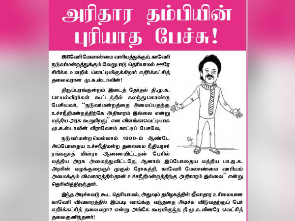 திருப்பரங்குன்றம் இடைத் தேர்தல் தி.மு.க. செயல்வீரர்கள் கூட்டத்தில் கலந்துகொண்டு பேசியவர், "நடுவர்மன்றத்தை அமைப்பதற்கு உச்சநீதிமன்றத்திற்கே அதிகாரம் இல்லை என்று மத்திய அரசு கூறுகிறது" என விளங்காவெட்டியாக மு.க.ஸ்டாலின் வீராவேசம் காட்டிப் பேசவே, நடுவர்மன்றமெல்லாம் 1990-ம் ஆண்டே அப்போதைய உச்சநீதிமன்ற தலைமை நீதியரசர் ரங்கநாத் மிஸ்ரா ஆணையிட்டதன் பேரில் மத்திய அரசு அமைத்துவிட்டதே, ஆனால் இப்போதைய மத்திய பா.ஜ.க. அரசின் வழக்குரைஞர் முகுல் ரோகத்தி, காவேரி மேலாண்மை வாரியம் அமைக்கும் விவகாரத்தில்தான் உச்சநீதிமன்றத்திற்கு அதிகாரம் இல்லை" என்று தெரிவித்திருந்தார்.