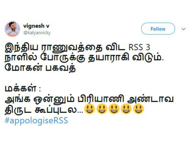 எங்கமா ராணுவத்தை உருவாக்குறாங்க பிரியாணி அண்டாவதான் தூக்குறாங்க.. மோகன் பகவத்தை விளாசும் நெட்டிசன்ஸ்
