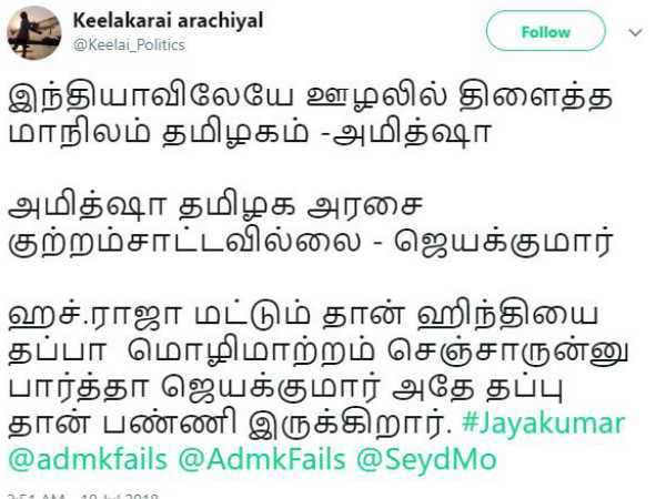 அதற்கு பதிலளித்த அமைச்சர் ஜெயக்குமார் தமிழக அரசை பற்றி அமித்ஷா நன்றாகத்தான் கூறியிருப்பார், எச் ராஜாதான் தவறாக மொழி பெயர்த்திருப்பார் என்றார். ஜெயக்குமாரின் இந்த பதிலால் நெட்டிசன்கள் ஆடிப்போயுள்ளனர்.