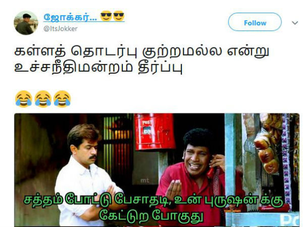 கள்ளத்தொடர்பு குற்றமல்ல என உச்சநீதிமன்றம் தீர்ப்பு வழங்கியுள்ளது குறித்து நெட்டிசன்கள் தங்களின் கருத்துக்களை தெரிவித்து வருகின்றன.