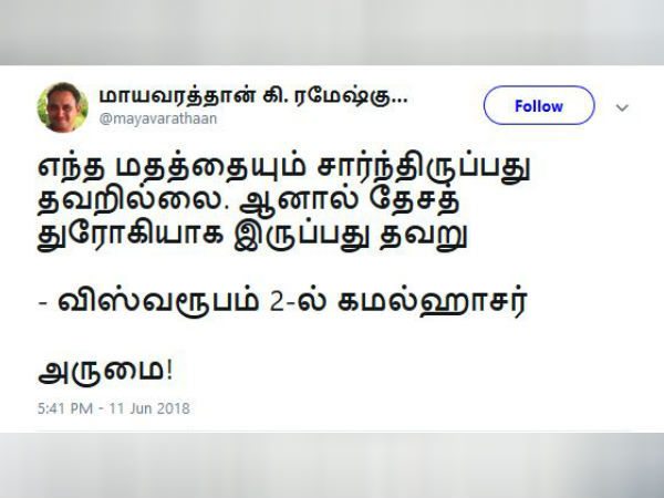 எந்த மதத்தையும் சார்ந்து இருக்கறது பாவமில்ல ப்ரதர், ஆன தேச துரோகியா இருக்குறது தப்பு - விஸ்வரூபம்2