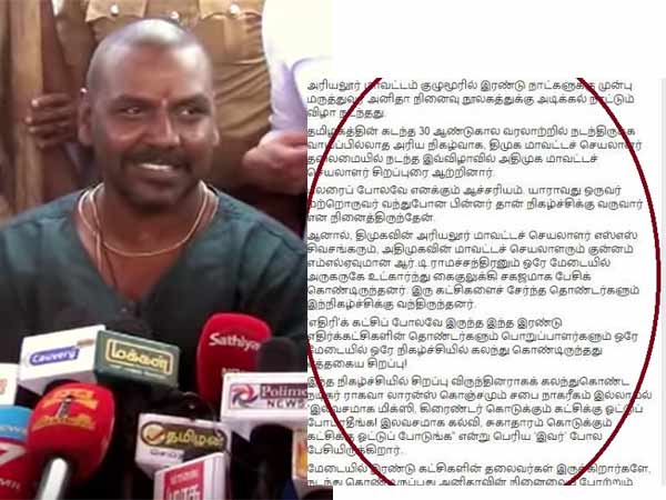 அரசியல் வேறுபாடுகளை மறந்து அதிமுக, திமுகவினர் பங்கேற்ற இந்நிகழ்ச்சியில் ராகவா லாரன்ஸ் உளறிக் கொட்டியிருக்கிறார். அரசியல் பேசுவதாக நினைத்துக் கொண்டு ராகவலா லாரன்ஸ் மேடையில் பேசியதைக் கண்டித்து ஃபேஸ்புக்கில் புதுக்குடியான் என்பவர் போட்டுள்ள பதிவு:
