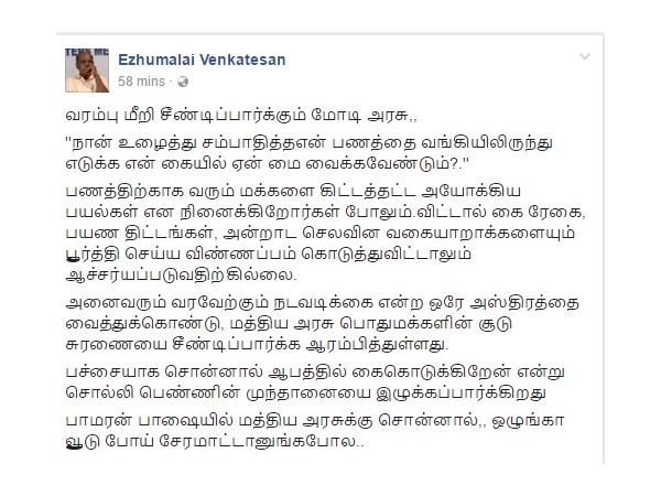 சென்னை: ரூபாய் நோட்டு செல்லாதது; வங்கிக்குப் போனால் மை வைப்பது போன்ற மத்திய அரசின் அறிவிப்புகள் பொதுமக்களை பயங்கரமாக கொந்தளிக்க வைத்துள்ளது. ஃபேஸ்புக்கில் சில பதிவர்கள் போட்டுள்ள ஆக்ரோஷமான பதிவுகளைப் பாருங்கள்: