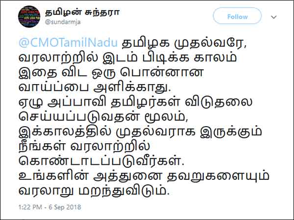 ஏழு அப்பாவி தமிழர்கள் விடுதலை செய்யப்படுவதன் மூலம், இக்காலத்தில் முதல்வராக இருக்கும் நீங்கள் வரலாற்றில் கொண்டாடப்படுவீர்கள்.