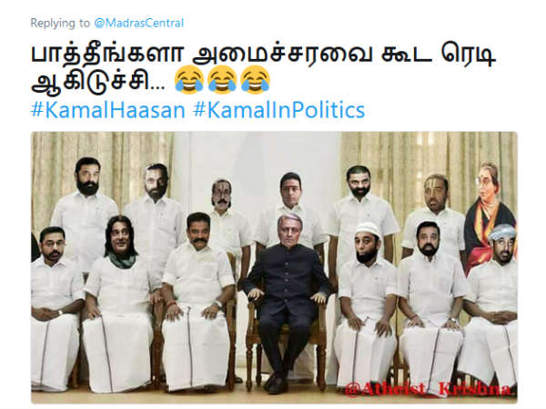 பாத்தீங்களா அமைச்சரவை கூட ரெடி ஆகிடுச்சி... என்கிறார் இந்த நெட்டிசன். கமல் அமைச்சரவை என்றால், அமைச்சர்கள் அத்தனை பேருமே கமலாகத்தான் இருப்பார். அவரே எல்லோருடைய வேஷத்தையும் போட்டுவிடுவார் என்கிறாி