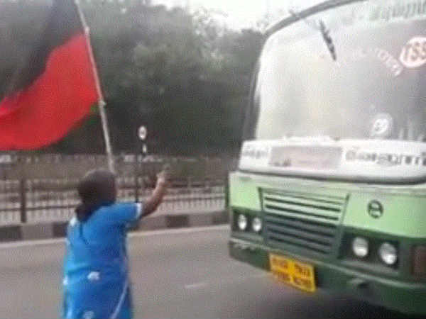வயதான பெண்மணி ஒருவர், தேசிய நெடுஞ்சாலையில் திமுக கொடியுடன் தன்னந்தனியாளாக பேருந்தை நிறுத்திய சம்பவம் திமுக உட்பட அனைத்து கட்சி தொண்டர்களையும் ஆச்சரியப்பட வைத்துள்ளது.
