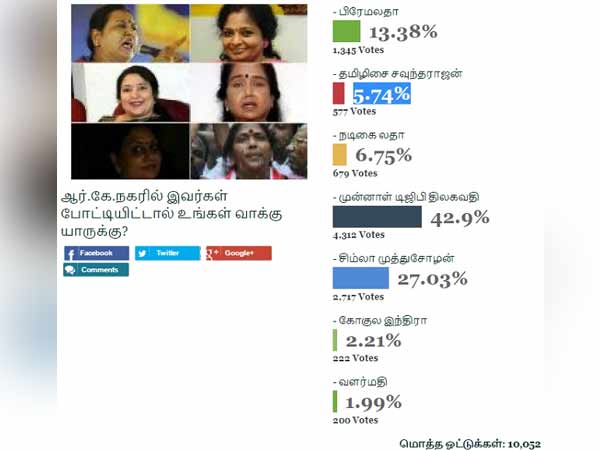 ஆர்.கே.நகரில் இவர்கள் போட்டியிட்டால் உங்கள் வாக்கு யாருக்கு? என்ற தலைப்பில் ஒன் இந்தியா தமிழ் இணையப் பக்கத்தில் கருத்து கணிப்பு நடத்தப்பட்டது. இந்த கருத்து கணிப்பில் 10,052 பேர் பங்கேற்றனர்.