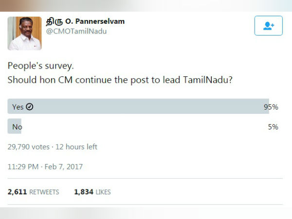 முதல்வர் ஓ.பி.எஸ் பெயரில் உள்ள டிவிட்டர் பக்கத்தில்தான் இந்த கேள்வி கேட்கப்பட்டிருந்தது. அக்கேள்விக்கு, முதல்வராக தொடர வேண்டும் என்று 95 சதவீதம் பேரும், நீடிக்க வேண்டாம் என்று 5 சதவீதம் பேரும் வாக்களித்துள்ளனர்.