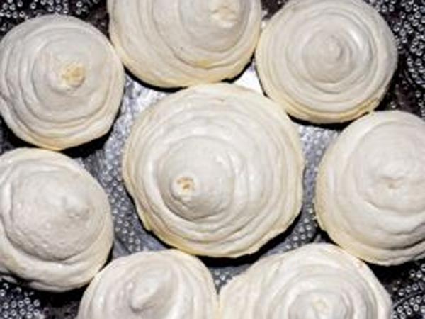 இதை அடிக்க அடிக்கஅடிக்க அடிக்க குப்பென மேலெழுந்து நுரை ததும்பும். சர்க்கரையை கொட்டி, திரும்பவும்அடிக்கவும் . பின், முந்திரிப் பவுடரை கொட்டி மிதமான பதத்தில் பிணைக்கவும் . பிறகு ஒரு பேப்பரை சுருள் பொட்டலம் போல போட்டுக் கொண்டு, அதற்குள் மாவை அள்ளிவைத்து, கீழ்பாகம் வழியாக மாவால் கோலம் போட, சுருள் வடிவத்தில் கீழே பரவுகிறது மாவு.வடிவம் கிடைத்ததும், பேக்கரி அடுப்பின் மேல்தளத்தில், மிதமான சூட்டில் மக்ரூன் தட்டுக்களை அடுக்கி காயவைக்கிறார்கள். ஒரு இரவு முழுதும் காய்ந்தால் "மக்ரூன்" ரெடி.