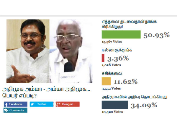 இரு கூறுகளாக அதிமுக பிரிந்து போனதை தேர்தல் ஆணையம் முறைப்படி கூறியுள்ளதைத் தொடர்ந்து அதிமுகவின் அழிவு தொடங்கி விட்டதாக 34.17 சதவீதம் பேர் கருத்து தெரிவித்துள்ளனர். அதாவது கிடைத்த வாக்குகள் 10,128.
