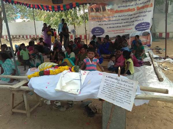 சுடுகாட்டு பாதையை ஆக்கிரமித்த அதிமுக பிரமுகர்.. பாடை கட்டி போராட்டம் நடத்திய மக்கள்