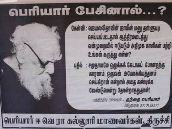 'பெரியார் பேசினால்...?' எனும் தலைப்பில் ஒட்டப்பட்டுள்ள இந்த போஸ்டரில், ''ஜெயலலிதா ஜாமீன் மனு தள்ளுபடி செய்யப்பட்டதால் ஆத்திரமடைந்து வன்முறையில் ஈடுபடும் அ.தி.மு.க. காலிகள் குறித்து உங்கள் கருத்து என்ன?'' என்று கேட்கப்பட்டுள்ளது.