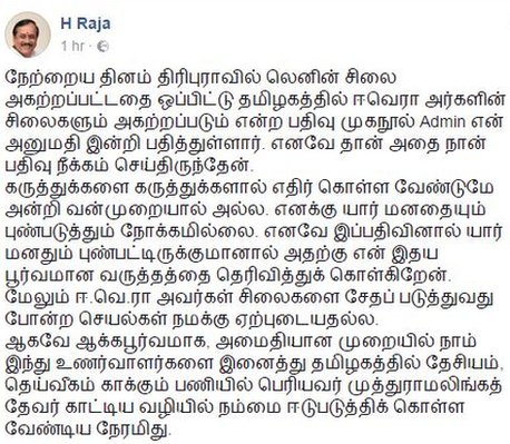 இந்த நிலையில், தன்னுடைய பக்கத்தில் வெளியான பதிவுக்கு எச். ராஜா வருத்தம் தெரிவித்தார். புதன் கிழமை காலையில் அவர் தன் பக்கத்தில் வெளியிட்டிருக்கும் செய்தியில், "நேற்றைய தினம் திரிபுராவில் லெனின் சிலை அகற்றப்பட்டதை ஒப்பிட்டு தமிழகத்தில் ஈவெரா அவர்களின் சிலைகளும் அகற்றப்படும் என்ற பதிவு முகநூல் Admin, என் அனுமதி இன்றி பதித்துள்ளார். எனவே தான் அதை நான் பதிவு நீக்கம் செய்திருந்தேன்" என்று கூறியிருக்கிறார்.