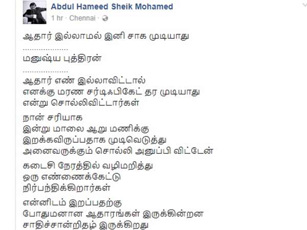 ஆதார் இல்லாமல் இனி சாக முடியாது என்ற மனுஷ்யபுத்திரனின் கவிதை சமூக வலைதளங்களில் வைரலாக ஷேர் செய்யப்படுகிறது.