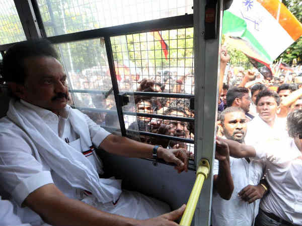 இதனையடுத்து ஸ்டாலின், திருநாவுக்கரசர், திருமாவளவன் உள்ளிட்ட அனைவரையும் காவல்துறையினர் கைது செய்தனர். ஸ்டாலினை குண்டு கட்டாக தூக்கிச் சென்று போலீசார் வேனில் ஏற்றியதால் பரபரப்பு ஏற்பட்டது. மண்டபத்தில் தங்க வைக்கப்பட்ட அனைவரும் மாலையில் விடுவிக்கப்பட்டனர். எதிர்கட்சியினர் பேரணி, சாலை மறியல் காரணமாக அண்ணாசாலை, மெரினா கடற்கரை சாலையில் போக்குவரத்து முற்றிலும் ஸ்தம்பித்தது. அலுவலகம் செல்வோர் கடும் அவதிக்கு ஆளாகினர்.