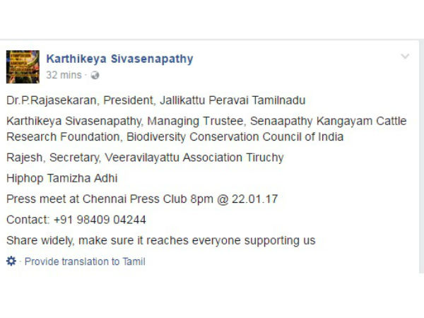 இந்த நிலையில் ஜல்லிக்கட்டுக்காக ஆரம்பத்திலிருந்து குரல் கொடுத்து வரும் தமிழக ஜல்லிக்கட்டு பேரவை தலைவர் டாக்டர் பி.ராஜசேகரன், சேனாபதி காங்கேயம் கால்நடை ஆய்வுக் கழக நிர்வாக அறங்காவலர் கார்த்திகேய சேனாபதி, திருச்சி வீர விளையாட்டுப் பேரவை செயலாளர் ராஜேஷ், இசையமைப்பாளர் ஹிப்ஹாப் தமிழா ஆதி ஆகியோர் செய்தியாளர்களைச் சந்திக்கவுள்ளனர்.+