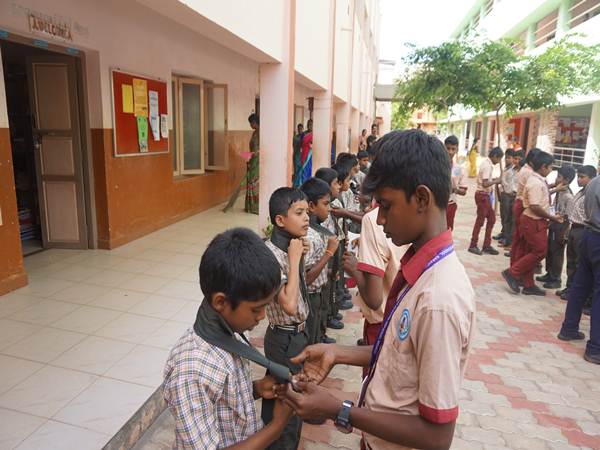 பள்ளியில் 9 மற்றும் 10 ம் வகுப்பு பயிலும் மாணவர்கள் புதிய மாணவர்களுக்கு சகோதர பாசத்துடன் டை கட்டடும் முறை குறித்து விளக்கி கூறினர்.