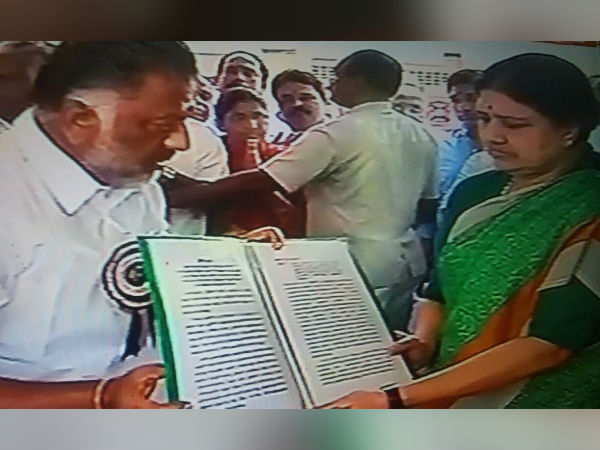 அந்த தீர்மான நகலை முதல்வர் ஓ.பன்னீர் செல்வம், தம்பிதுறை உள்ளிட்டோர் சசிகலாவிடம் வழங்கினர். அப்போது ஜெயலலிதாவைப் போல பச்சை கலர் சென்டிமென்டை பின்பற்றிய சசி 'பச்சைப் புடவையில்' தீர்மான நகலை பெற்றுக்கொண்டார்.