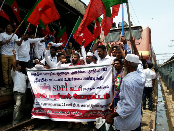 ரயில் கட்டண உயர்வை எதிர்த்து எஸ்.டி.பி.ஐ ரயில் மறியல் – நூற்றுக்கணக்கானோர் கைது