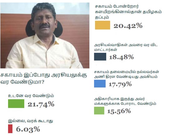 சிலர் இந்த விஷயம் பற்றி வேறு விதத்தில் வாக்களித்துள்ளார்கள். அதன்படி சகாயம் போன்றோர் களமிறங்கினால்தான் தமிழகம் தப்பும் என்று 20.53% மக்கள் வாக்களித்துள்ளார்கள்.