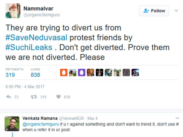 சென்னை வெள்ளத்தின் போது பீப் பாடல் வெளியானது, ஜல்லிக்கட்டு போராட்டத்தின் போது அனிருத் வீடியோ வெளியானது. இப்போது நெடுவாசலை திசை திருப்ப சுசீ லீக்ஸ் இன்னும் எத்தனையை எத்தனை திசை திருப்பல்கள் என்று கேட்கின்றனர் சமூக வலைத்தளவாசிகள்.