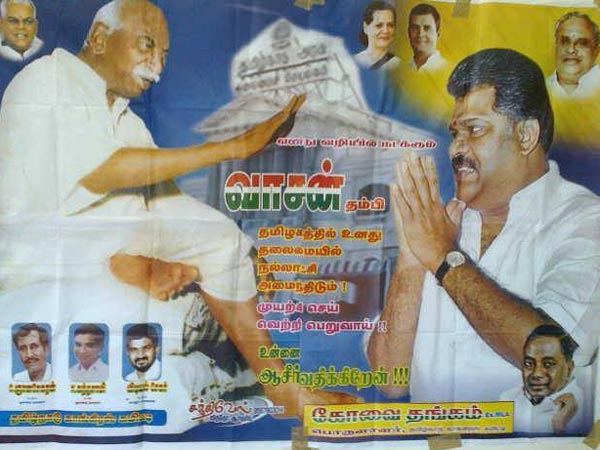 தற்போதும் அப்படித்தான் ஒரு சுவரொட்டி சென்னை நகரில் பல இடங்களில் ஒட்டப்பட்டுள்ளது. அந்த சுவரொட்டியில் காமராஜர் படத்தைப் போட்டு அதன் கீழே, "எனது வழியில் நடக்கும் வாசன் தம்பி, தமிழகத்தில் உனது தலைமையில் நல்லாட்சி அமைந்திடும். முயற்சி செய். வெற்றிபெறுவாய். உன்னை ஆசீர்வதிக்கிறேன்!'' என்ற வாசகங்கள் இடம்பெற்றுள்ளன.
