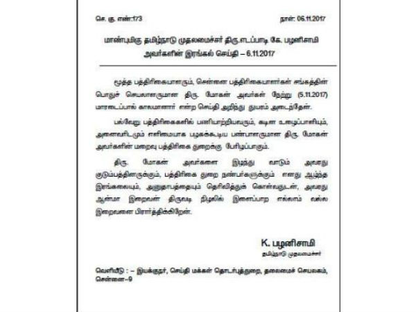 மோகனின் மறைவு பத்திரிக்கை துறைக்கு பேரிழப்பாகும். மோகன் அவர்களை இழந்து வாடும் அவரது குடும்பத்தினருக்கும் பத்திரிகை துறை நண்பர்களுக்கும் ஆழ்ந்த இரங்கலை தெரிவித்துக் கொள்கிறேன். அவரது ஆத்மா இறைவன் திருவடி நிழலில் இளைப்பாற எல்லாம் வல்ல இறைவனை பிரார்த்திக்கிறேன் என்று முதல்வர் இரங்கல் தெரிவித்துள்ளார்.