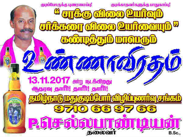 மது மற்றும் சர்க்கரை விலை உயர்வைக் கண்டித்து மதுக்குடிப்போர் சங்கத்தினர் போராட்டம் நடத்தப் போவதாக அறிவித்துள்ளனர்.