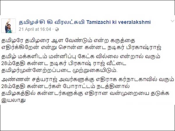 அந்தக் கட்சியின் தலைவர் கி. வீரலட்சுமி முகநூல் பக்கத்தில் வெளியிட்டுள்ள கருத்தில், தமிழரே தமிழரை ஆள வேண்டும் என்ற கருத்தை எதிர்ப்பதாக கன்னட நடிகர் பிரகாஷ் ராஜ் தெரிவித்துள்ளார்.