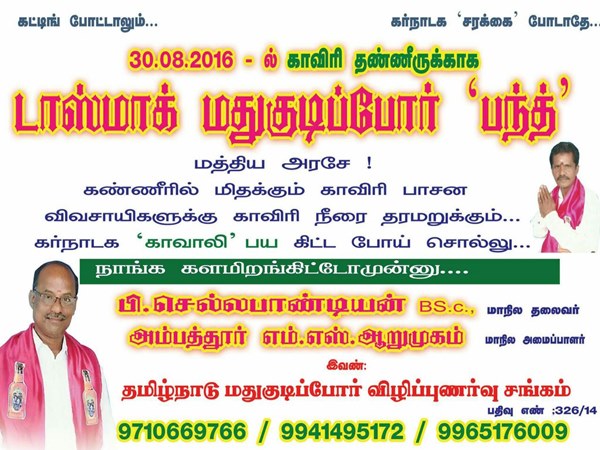 கட்டிங் போட்டாலும்.. கர்நாடக சரக்கைப் போடாதே.. 30.8.2016ல் காவிரி தண்ணீருக்காக டாஸ்மாக் மது குடிப்போர் பந்த்.